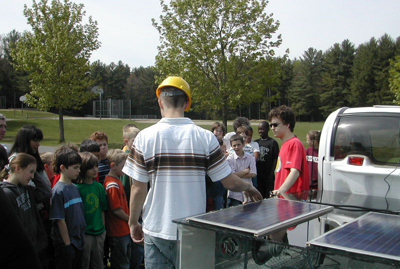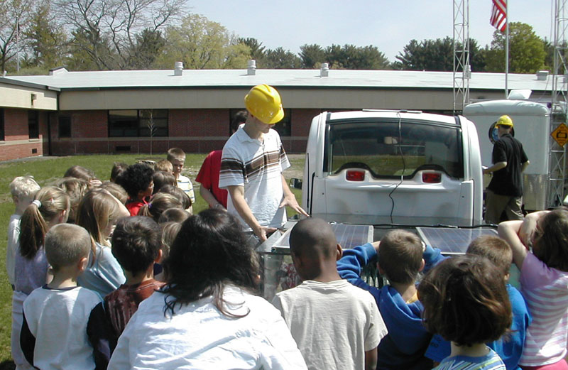 This shows high school students briefing elementary school children on the GEM solar electric vehicle and the Mobile Alternative Energy Laboratory.