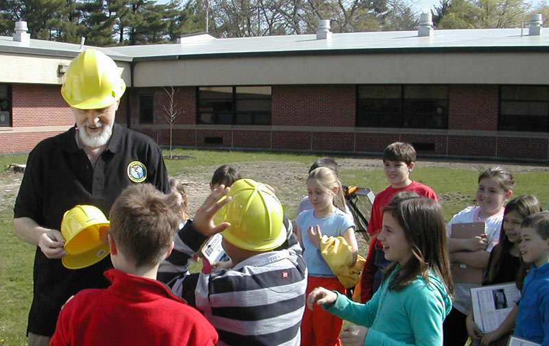 This shows student volunteers, who participated in laboratory demonstrations, receiving their hard hats.